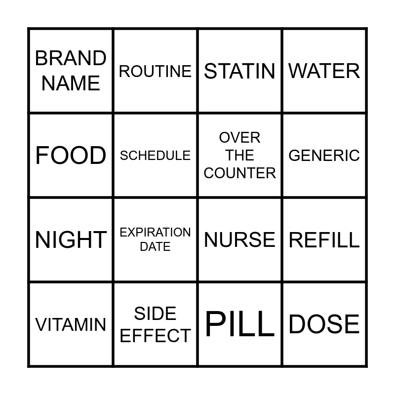This bingo card has 16 words: SIDE EFFECT, REFILL, STATIN, BRAND NAME, NIGHT, ROUTINE, NURSE, PILL, FOOD, SCHEDULE, VITAMIN, WATER, EXPIRATION DATE, GENERIC, OVER THE COUNTER and DOSE.