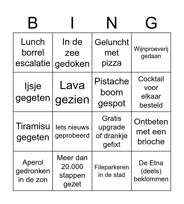 This bingo card has 16 words: Aperol gedronken in de zon, Meer dan 20.000 stappen gezet, Geluncht met pizza, Wijnproeverij gedaan, Ijsje gegeten, In de zee gedoken, Gratis upgrade of drankje gefixt, Ontbeten met een brioche, Lunch borrel escalatie, Lava gezien, Fileparkeren in de stad, Cocktail voor elkaar besteld, Tiramisu gegeten, Iets nieuws geprobeerd, Pistache boom gespot and De Etna (deels) beklommen.