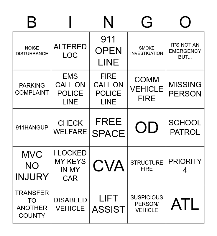 This bingo card has a free space and 29 words: TEXT TO 911, DISABLED VEHICLE, 911 OPEN LINE, PATROL CHECK, IT'S NOT AN EMERGENCY BUT..., NOISE DISTURBANCE, EMS CALL ON POLICE LINE, FIRE CALL ON POLICE LINE, OD, PRIORITY 4, TRANSFER TO ANOTHER COUNTY, CHECK WELFARE, SUSPICIOUS PERSON/ VEHICLE, ATL, 911HANGUP, TRAFFIC STOP, LIFT ASSIST, STRUCTURE FIRE, MISSING PERSON, MVC NO INJURY, I LOCKED MY KEYS IN MY CAR, DOMESTIC, COMM VEHICLE FIRE, SCHOOL PATROL, PARKING COMPLAINT, ALTERED LOC, CVA, SMOKE INVESTIGATION and ANIMAL CONTROL.