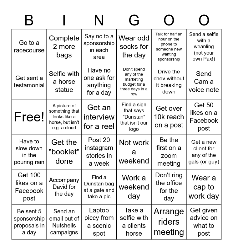 This bingo card has 36 words: Work a weekend day, Find a Dunstan bag at a gate and take a pic, Take a selfie with a clients horse, Get sent a testamonial, Have to slow down in the pouring rain, Find a sign that says "Dunstan" that isn't our logo, Selfie with a horse statue, Laptop piccy from a scenic spot, Talk for half an hour on the phone to someone new wanting sponsorship, Don't ring the office for the day, Send Cam a voice note, Wear odd socks for the day, Wear a cap to work day, A picture of something that looks like a horse, but isn't e.g. a cloud, Don't spend any of the marketing budget for a three days in a row, Go to a racecourse, Get 100 likes on a Facebook post, Get over 10k reach on a post, Free!, Say no to a sponsorship in each area, Get an interview for a reel, Get the "booklet" done, Not work a weekend, Post 20 instagram stories in a week, Be the first on a zoom meeting, Complete 2 more bags, Drive the chev without it breaking down, Send an email out of Nutshells campaigns, Have no one ask for anything for a day, Send a selfie with a weanling (not your own Pax!), Get given advice on what to post, Be sent 5 sponsorship proposals in a day, Get a new client for any of the gals (or guy), Get 50 likes on a Facebook post, Accompany David for the day and Arrange riders meeting.