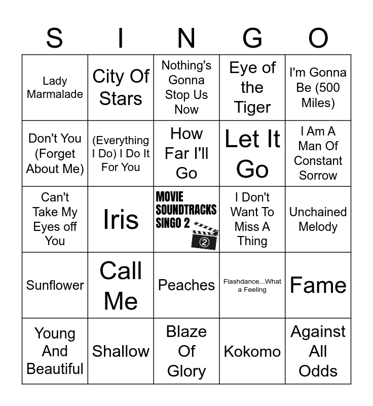 This bingo card has a free space and 50 words: Accidentally In Love, Against All Odds, All Star, Blaze Of Glory, Call Me, CAN'T STOP THE FEELING!, City Of Stars, Decode, Don't You (Forget About Me), End Of The Road, (Everything I Do) I Do It For You, Eye of the Tiger, Fame, Flashdance...What a Feeling, Gangsta's Paradise, Hold My Hand, How Far I'll Go, I Don't Want To Miss A Thing, I See Fire, I'm Gonna Be (500 Miles), Iris, Kokomo, Lady Marmalade, Let It Go, Love Me Like You Do, Mad World, I Am A Man Of Constant Sorrow, No Time To Die, Nothing's Gonna Stop Us Now, Peaches, Perfect Day, Remember Me, See You Again, Shakedown, Shallow, Streets of Philadelphia, Take My Breath Away, The Power Of Love, (I've Had) The Time Of My Life, Unchained Melody, Up Where We Belong, We Don't Talk About Bruno, What Was I Made For?, Wild Thing, Young And Beautiful, Can't Take My Eyes off You, Happy, Lift Me Up, Sunflower and Jai Ho! (You Are My Destiny).