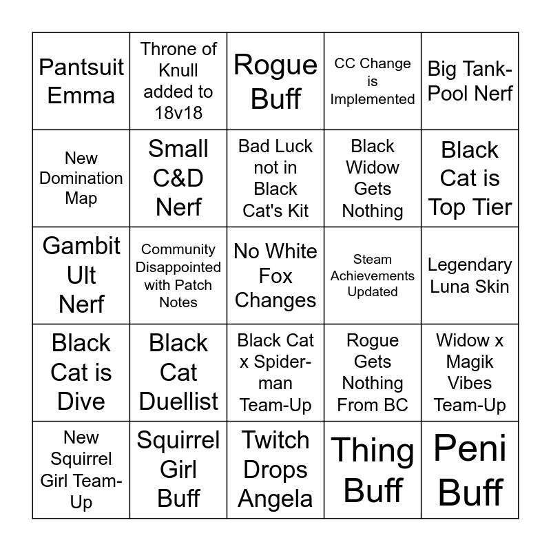 This bingo card has 25 words: Black Cat Duellist, Twitch Drops Angela, Bad Luck not in Black Cat's Kit, New Squirrel Girl Team-Up, Big Tank-Pool Nerf, Pantsuit Emma, New Domination Map, Throne of Knull added to 18v18, Steam Achievements Updated, Black Cat x Spider-man Team-Up, Black Widow Gets Nothing, Gambit Ult Nerf, Rogue Gets Nothing From BC, Widow x Magik Vibes Team-Up, Small C&D Nerf, Peni Buff, Legendary Luna Skin, Rogue Buff, Black Cat is Top Tier, Community Disappointed with Patch Notes, No White Fox Changes, Squirrel Girl Buff, Black Cat is Dive, CC Change is Implemented and Thing Buff.