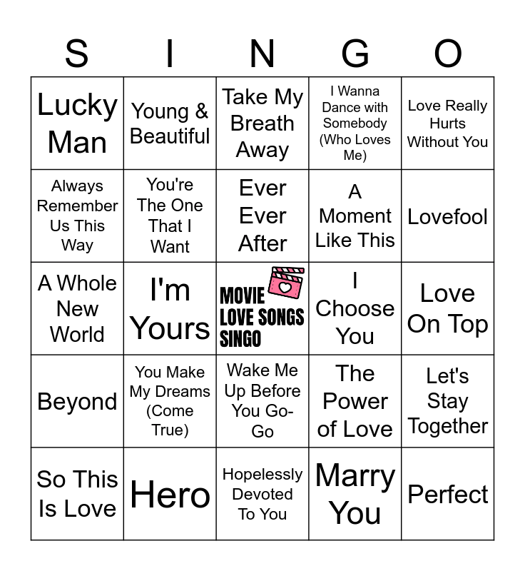 This bingo card has a free space and 50 words: All of Me, Perfect, Iris, Hopelessly Devoted To You, You Make My Dreams (Come True), Suddenly, Young & Beautiful, Rewrite The Stars, Always Remember Us This Way, Kissing You, You're The One That I Want, I Wanna Dance with Somebody (Who Loves Me), Let's Stay Together, The Power of Love, She Will Be Loved, The Way You Look Tonight, Ever Ever After, I Choose You, Crazy Little Thing Called Love, Love Really Hurts Without You, I'm Yours, Marry You, Lucky Man, A Moment Like This, Bleeding Love, Love Is All Around, Lovefool, With You, Take My Breath Away, Wake Me Up Before You Go-Go, I'll Be There for You, If I Ain't Got You, Truly Madly Deeply, When a Man Loves a Woman, Hero, Amazed, How Deep Is Your Love, I'm A Believer, Don't Go Breaking My Heart, Love On Top, Because You Loved Me, Can't Take My Eyes off You, Heaven, She, So This Is Love, A Whole New World, Just the Way You Are, Say You Won't Let Go, Beyond and XO.