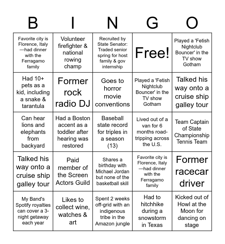 This bingo card has 79 words: Played a game with Rachel Ray & Kevin Bacon, Pursuing Italian citizenship since 2023—verdict expected in 2027, Recruited by State Senator: Traded senior spring for host family & gov internship, Picked up by John Candy after a preschool fall & received an 'atta boy.', Saved a man's life with 4 min of CPR—still in touch, Volunteer firefighter & national rowing champ, Worked at Eddie Rockets in Ireland for 3 months post-college, Spent a year in Russia launching Snickers & M&M's sales & distribution, Union construction worker, Rang NASDAQ Opening & NYSE Closing bells, Former racecar driver, Had a Boston accent as a toddler after hearing was restored, Free!, Favorite city is Florence, Italy—had dinner with the Ferragamo family, Went skydiving with their dad on their 18th birthday, Had 10+ pets as a kid, including a snake & tarantula, Climbed 38 of Colorado's 58 fourteeners, Paid member of the Screen Actors Guild, Played the accordion for years (under duress), Team Captain of State Championship Tennis Team, Shares a birthday with Michael Jordan but none of the basketball skill, Played a 'Fetish Nightclub Bouncer' in the TV show Gotham, Can hear lions and elephants from backyard, Goes to horror movie conventions, Former rock radio DJ, Dad is TikTok famous (100k+ followers), Two-time cornhole tournament champion, Charged by an elephant and buffalo on African safari, Won a one-design sailing competition as skipper, Got 'last worded' by Barack Obama in the Oval Office, Talked his way onto a cruise ship galley tour, Likes to collect wine, watches & art, Spent 2 weeks off-grid with an indigenous tribe in the Amazon jungle, Kicked out of Howl at the Moon for dancing on stage, My Band's Spotify royalties can cover a 3-night getaway each year, Lived out of a van for 6 months road-tripping across the U.S., Had to hitchhike during a snowstorm in Texas, Used to live in a van, Made final 50 of 20K applicants for The Bachelorette Season 8, Baseball state record for triples in a season (13), Played a game with Rachel Ray & Kevin Bacon, Pursuing Italian citizenship since 2023—verdict expected in 2027, Recruited by State Senator: Traded senior spring for host family & gov internship, Picked up by John Candy after a preschool fall & received an 'atta boy.', Saved a man's life with 4 min of CPR—still in touch, Volunteer firefighter & national rowing champ, Worked at Eddie Rockets in Ireland for 3 months post-college, Spent a year in Russia launching Snickers & M&M's sales & distribution, Union construction worker, Rang NASDAQ Opening & NYSE Closing bells, Former racecar driver, Had a Boston accent as a toddler after hearing was restored, Favorite city is Florence, Italy—had dinner with the Ferragamo family, Went skydiving with their dad on their 18th birthday, Had 10+ pets as a kid, including a snake & tarantula, Climbed 38 of Colorado's 58 fourteeners, Paid member of the Screen Actors Guild, Played the accordion for years (under duress), Team Captain of State Championship Tennis Team, Shares a birthday with Michael Jordan but none of the basketball skill, Played a 'Fetish Nightclub Bouncer' in the TV show Gotham, Can hear lions and elephants from backyard, Goes to horror movie conventions, Former rock radio DJ, Dad is TikTok famous (100k+ followers), Two-time cornhole tournament champion, Charged by an elephant and buffalo on African safari, Won a one-design sailing competition as skipper, Got 'last worded' by Barack Obama in the Oval Office, Talked his way onto a cruise ship galley tour, Likes to collect wine, watches & art, Spent 2 weeks off-grid with an indigenous tribe in the Amazon jungle, Kicked out of Howl at the Moon for dancing on stage, My Band's Spotify royalties can cover a 3-night getaway each year, Lived out of a van for 6 months road-tripping across the U.S., Had to hitchhike during a snowstorm in Texas, Used to live in a van, Made final 50 of 20K applicants for The Bachelorette Season 8 and Baseball state record for triples in a season (13).