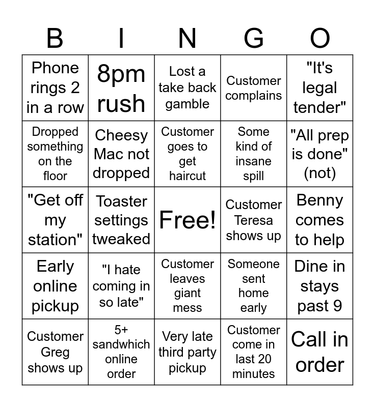 This bingo card has a free space and 24 words: Customer Greg shows up, "I hate coming in so late", Customer goes to get haircut, Customer come in last 20 minutes, "It's legal tender", Phone rings 2 in a row, 8pm rush, Lost a take back gamble, Customer Teresa shows up, Benny comes to help, "Get off my station", Cheesy Mac not dropped, Someone sent home early, Dine in stays past 9, Dropped something on the floor, 5+ sandwhich online order, Very late third party pickup, Customer complains, "All prep is done" (not), Early online pickup, Toaster settings tweaked, Customer leaves giant mess, Some kind of insane spill and Call in order.