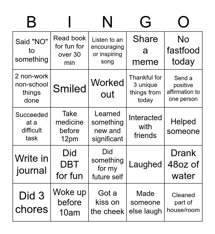 This bingo card has a free space and 24 words: Did DBT for fun, Woke up before 10am, Worked out, Did 3 chores, No fastfood today, Said "NO" to something, 2 non-work non-school things done, Read book for fun for over 30 min, Interacted with friends, Did something for my future self, Thankful for 3 unique things from today, Succeeded at a difficult task, Laughed, Drank 48oz of water, Smiled, Made someone else laugh, Helped someone, Listen to an encouraging or inspiring song, Send a positive affirmation to one person, Take medicine before 12pm, Cleaned part of house/room, Write in journal, Share a meme and Got a kiss on the cheek.