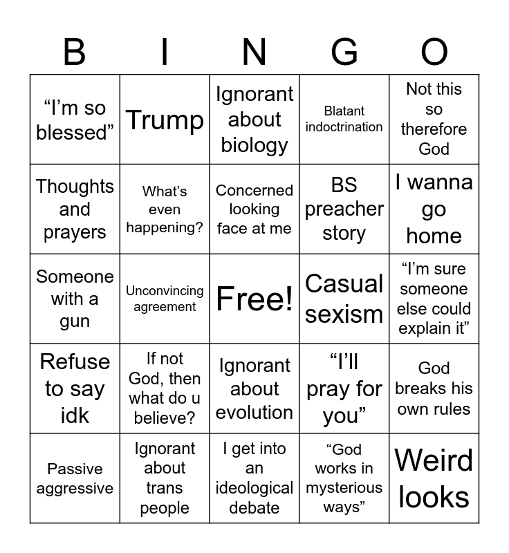 This bingo card has a free space and 24 words: If not God, then what do u believe?, Ignorant about trans people, Concerned looking face at me, Passive aggressive, Not this so therefore God, “I’m so blessed”, Thoughts and prayers, Trump, Casual sexism, Ignorant about evolution, BS preacher story, Someone with a gun, “I’ll pray for you”, God breaks his own rules, What’s even happening?, “God works in mysterious ways”, “I’m sure someone else could explain it”, Ignorant about biology, I wanna go home, Unconvincing agreement, Weird looks, Refuse to say idk, Blatant indoctrination and I get into an ideological debate.
