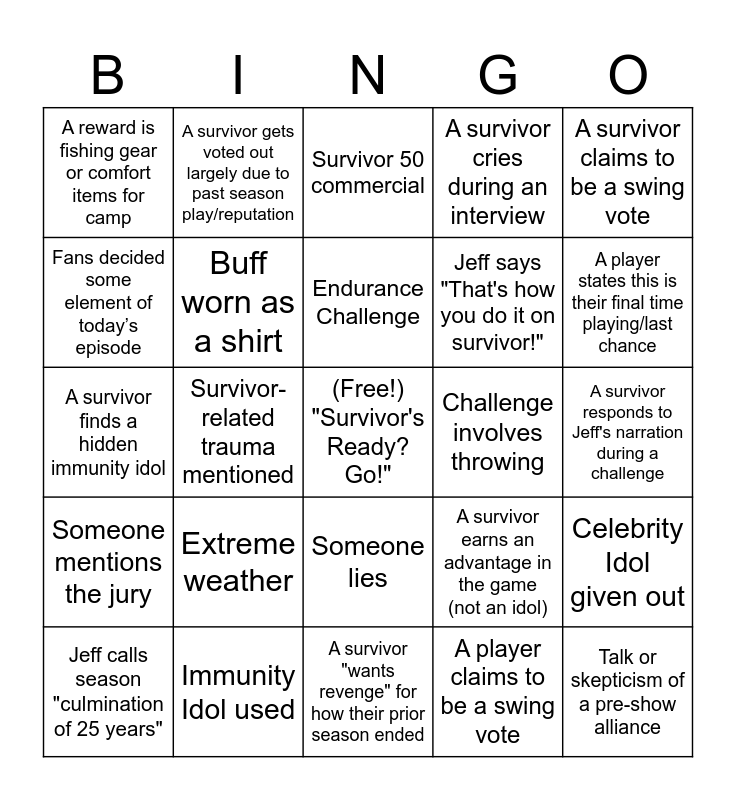 This bingo card has a free space and 71 words: There is a creepy crawly insert shot, A survivor gets voted out largely due to past season play/reputation, A survivor makes fire without flint, A survivor calls themself a legend, A survivor "wants revenge" for how their prior season ended, There is a tie at tribal council, A survivor cries during an interview, Major Challenge Comeback, Jeff says "That's how you do it on survivor!", Sassy Jeff Moment, Jeff calls season "culmination of 25 years", A survivor calls themself a "Superfan", A player states this is their final time playing/last chance, A reward is fishing gear or comfort items for camp, A survivor is referred to as the tribe leader, A survivor finds a hidden immunity idol, A survivor earns an advantage in the game (not an idol), A survivor claims to be a swing vote, Mr. Beast shows up/is mentioned, A survivor responds to Jeff's narration during a challenge, Extreme weather, Talk or skepticism of a pre-show alliance, Celebrity Idol given out, A survivor mentions their children at home, There is a medical evacuation or a survivor quits, A survivor gets voted out while in possession of an idol, A survivor makes a salty statement in their exit interview, A survivor's name is misspelled in a vote, A survivor calls themself "old" or tribe mom/dad, Hidden Immunity Idol found, Immunity Idol used, Celebrity shows up/is mentioned, Crying during a confessional, A player’s name is misspelled in a vote, A player claims to be a swing vote, “THAT’S HOW YOU DO IT ON SURVIVOR!!”, Comeback during a challenge, Alliance name drop, Fans decided some element of today’s episode, Secret convo @ water well, Someone lies, A player goes against their alliance, Someone mentions the jury, Chopping coconut, Someone says “tribe strong”, Boat Appearance, Someone says “final [number]”, Buff worn as a shirt, Someone talks about a “big move”, Player claims they are on the bottom, Something censored, Wine/Beer as part of reward, Challenge involves throwing, Challenge involves crawling, Challenge involves puzzle, Producers add how long the challenge has been going, Endurance Challenge, “Honor & Integrity”, Player apologizes, “Betrayed”, “Have to stay strong”, “Operation ________”, Survivor-related trauma mentioned, Emily acts crazy, Christian is acting, Someone makes a metaphor, Survivor 50 commercial, Jeff does something CRINGE, Buff as necktie, Buff as bow and Picture/drawing on vote.