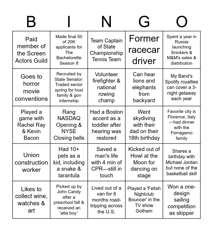 This bingo card has 40 words: Free!, Played a game with Rachel Ray & Kevin Bacon, Pursuing Italian citizenship since 2023—verdict expected in 2027, Recruited by State Senator: Traded senior spring for host family & gov internship, Picked up by John Candy after a preschool fall & received an 'atta boy.', Saved a man's life with 4 min of CPR—still in touch, Volunteer firefighter & national rowing champ, Worked at Eddie Rockets in Ireland for 3 months post-college, Spent a year in Russia launching Snickers & M&M's sales & distribution, Union construction worker, Rang NASDAQ Opening & NYSE Closing bells, Former racecar driver, Had a Boston accent as a toddler after hearing was restored, Favorite city is Florence, Italy—had dinner with the Ferragamo family, Went skydiving with their dad on their 18th birthday, Had 10+ pets as a kid, including a snake & tarantula, Climbed 38 of Colorado's 58 fourteeners, Paid member of the Screen Actors Guild, Played the accordion for years (under duress), Team Captain of State Championship Tennis Team, Shares a birthday with Michael Jordan but none of the basketball skill, Played a 'Fetish Nightclub Bouncer' in the TV show Gotham, Can hear lions and elephants from backyard, Goes to horror movie conventions, Former rock radio DJ, Dad is TikTok famous (100k+ followers), Two-time cornhole tournament champion, Charged by an elephant and buffalo on African safari, Won a one-design sailing competition as skipper, Got 'last worded' by Barack Obama in the Oval Office, Talked his way onto a cruise ship galley tour, Likes to collect wine, watches & art, Spent 2 weeks off-grid with an indigenous tribe in the Amazon jungle, Kicked out of Howl at the Moon for dancing on stage, My Band's Spotify royalties can cover a 3-night getaway each year, Lived out of a van for 6 months road-tripping across the U.S., Had to hitchhike during a snowstorm in Texas, Used to live in a van, Made final 50 of 20K applicants for The Bachelorette Season 8 and Baseball state record for triples in a season (13).