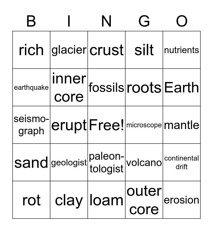 This bingo card has a free space and 24 words: geologist, clay, fossils, rot, nutrients, rich, earthquake, glacier, microscope, paleon- tologist, roots, seismo- graph, volcano, continental drift, inner core, outer core, mantle, crust, Earth, erupt, erosion, sand, silt and loam.