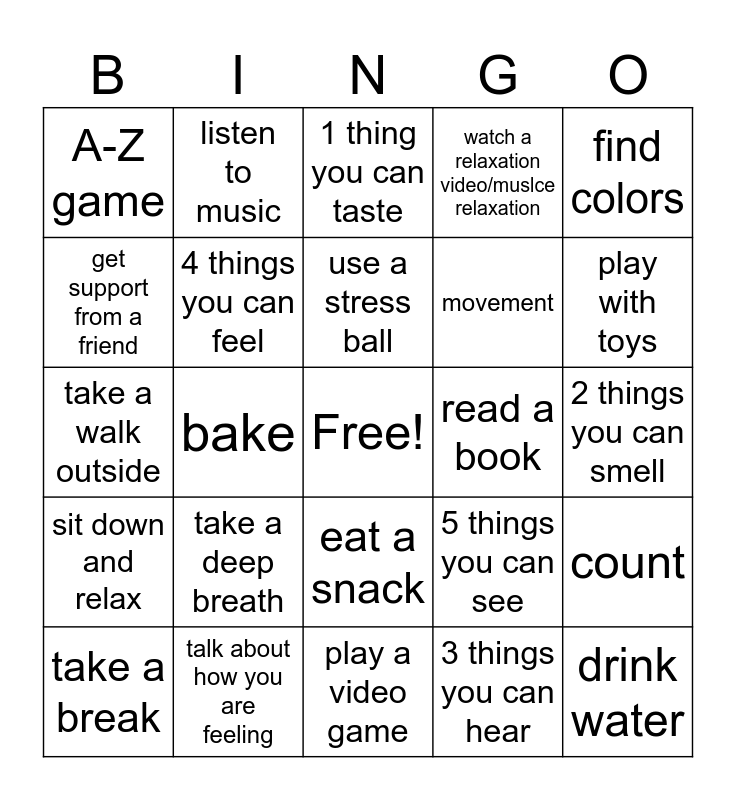 This bingo card has a free space and 24 words: take a deep breath, talk about how you are feeling, use a stress ball, take a break, find colors, A-Z game, get support from a friend, listen to music, read a book, eat a snack, movement, take a walk outside, 5 things you can see, count, 4 things you can feel, 3 things you can hear, 2 things you can smell, 1 thing you can taste, play with toys, bake, drink water, sit down and relax, watch a relaxation video/muslce relaxation and play a video game.