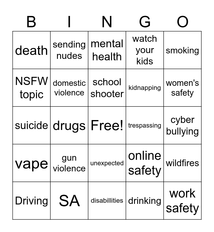 This bingo card has a free space and 24 words: Driving, gun violence, school shooter, drinking, smoking, death, sending nudes, mental health, trespassing, cyber bullying, suicide, domestic violence, online safety, wildfires, NSFW topic, SA, disabillities, watch your kids, women's safety, vape, drugs, unexpected, kidnapping and work safety.