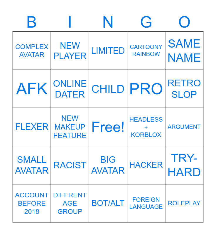 This bingo card has a free space and 24 words: RACIST, DIFFRENT AGE GROUP, CHILD, ACCOUNT BEFORE 2018, SAME NAME, COMPLEX AVATAR, AFK, NEW PLAYER, HEADLESS + KORBLOX, BIG AVATAR, PRO, FLEXER, HACKER, TRY-HARD, ONLINE DATER, FOREIGN LANGUAGE, ARGUMENT, LIMITED, RETRO SLOP, NEW MAKEUP FEATURE, ROLEPLAY, SMALL AVATAR, CARTOONY RAINBOW and BOT/ALT.