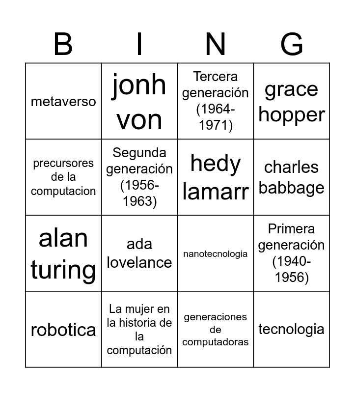 This bingo card has 17 words: generaciones de computadoras, robotica, Tercera generación (1964-1971), metaverso, ada lovelance, grace hopper, Primera generación (1940-1956), hedy lamarr, charles babbage, Segunda generación (1956-1963), La mujer en la historia de la computación, nanotecnologia, precursores de la computacion, jonh von, alan turing, Cuarta generación (1971-presente) and tecnologia.