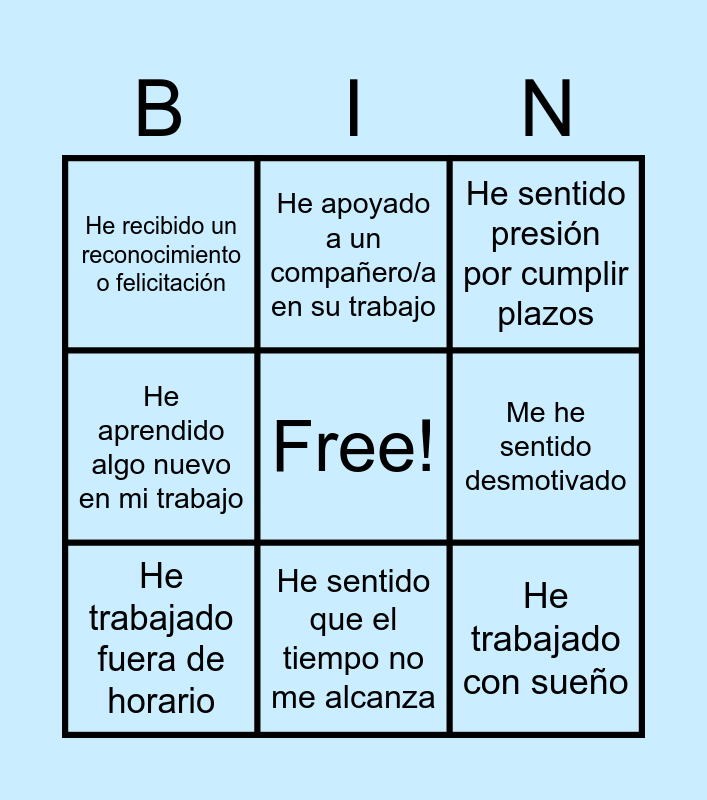 This bingo card has a free space and 9 words: He trabajado fuera de horario, He sentido presión por cumplir plazos, He apoyado a un compañero/a en su trabajo, He aprendido algo nuevo en mi trabajo, He recibido un reconocimiento o felicitación, Me he sentido desmotivado, He trabajado con sueño, He tenido problemas con el internet en plena reunión and He sentido que el tiempo no me alcanza.