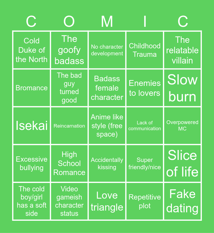 This bingo card has a free space and 25 words: High School Romance, Love triangle, Badass female character, The cold boy/girl has a soft side, The relatable villain, Cold Duke of the North, Bromance, The goofy badass, Lack of communication, Accidentally kissing, Enemies to lovers, Isekai, Super friendly/nice, Slice of life, The bad guy turned good, Friends to lovers, Overpowered MC, No character development, Slow burn, Reincarnation, Fake dating, Video gameish character status, Excessive bullying, Childhood Trauma and Repetitive plot.