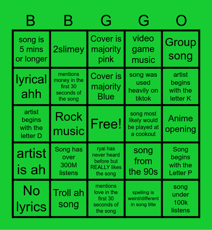 This bingo card has a free space and 24 words: Song has over 300M listens, Troll ah song, Cover is majority Blue, No lyrics, Group song, song is 5 mins or longer, lyrical ahh, 2slimey, song most likely would be played at a cookout, ryai has never heard before but REALLY likes the song, song was used heavily on tiktok, artist begins with the letter D, song from the 90s, Song begins with the Letter P, mentions money in the first 30 seconds of the song, spelling is weird/different in song tilte, Anime opening, Cover is majority pink, artist begins with the letter K, Rock music, song under 100k listens, artist is ah, video game music and mentions love in the first 30 seconds of the song.