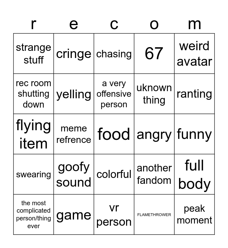 This bingo card has 25 words: swearing, game, food, FLAMETHROWER, weird avatar, strange stuff, cringe, chasing, angry, full body, rec room shutting down, yelling, vr person, another fandom, ranting, the most complicated person/thing ever, meme refrence, a very offensive person, uknown thing, funny, flying item, goofy sound, colorful, 67 and peak moment.
