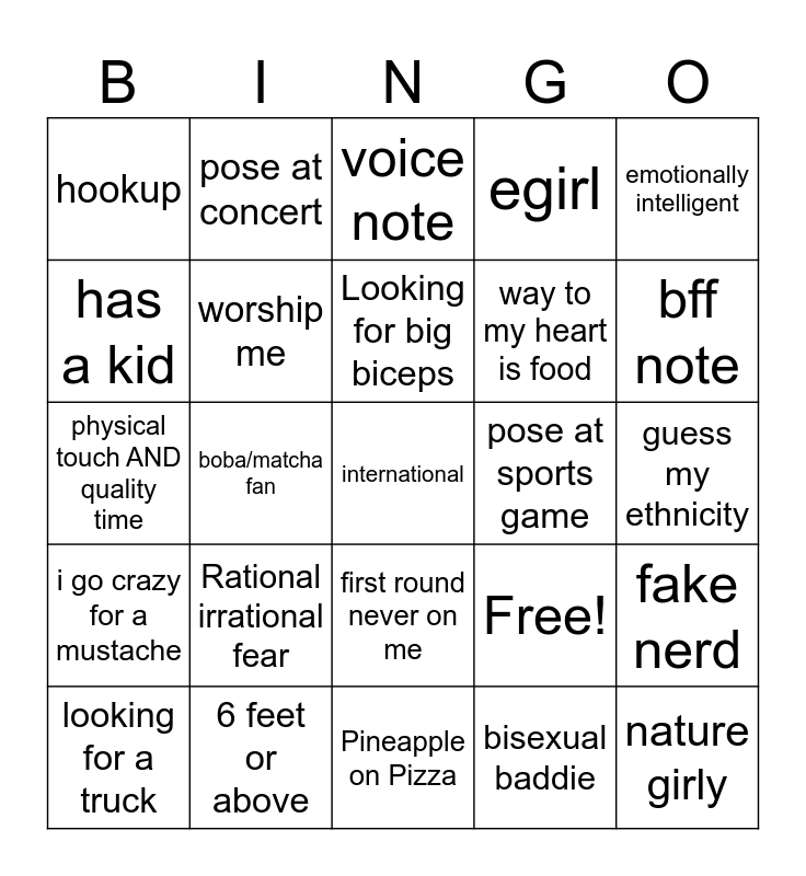 This bingo card has 25 words: Rational irrational fear, Pineapple on Pizza, Looking for big biceps, looking for a truck, emotionally intelligent, hookup, has a kid, pose at concert, pose at sports game, first round never on me, way to my heart is food, physical touch AND quality time, Free!, fake nerd, worship me, nature girly, guess my ethnicity, voice note, bff note, boba/matcha fan, international, 6 feet or above, i go crazy for a mustache, egirl and bisexual baddie.