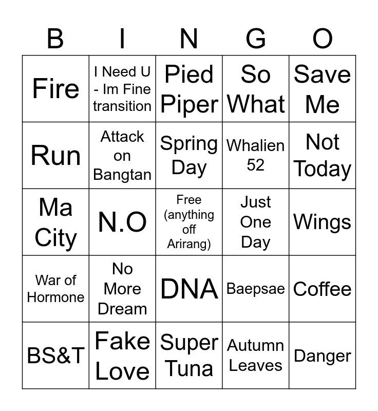 This bingo card has a free space and 24 words: No More Dream, Fake Love, Spring Day, BS&T, Save Me, Fire, Run, I Need U - Im Fine transition, Just One Day, DNA, Whalien 52, Ma City, Baepsae, Coffee, Attack on Bangtan, Autumn Leaves, Wings, Pied Piper, Not Today, N.O, Danger, War of Hormone, So What and Super Tuna.