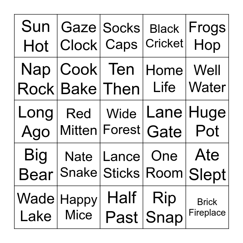 This bingo card has 25 words: Nate Snake, Half Past, Ten Then, Wade Lake, Frogs Hop, Sun Hot, Nap Rock, Gaze Clock, Lane Gate, Lance Sticks, Home Life, Long Ago, One Room, Ate Slept, Cook Bake, Brick Fireplace, Huge Pot, Socks Caps, Well Water, Red Mitten, Wide Forest, Happy Mice, Big Bear, Black Cricket and Rip Snap.