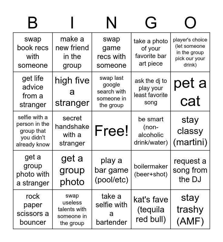 This bingo card has a free space and 31 words: take a selfie with a bartender, take a selfie with a bouncer, secret handshake with a stranger, secret handshake with a friend, swap book recs with someone, swap game recs with someone, high five a stranger, boilermaker (beer+shot), be smart (non-alcoholic drink/water), kat's fave (tequila red bull), stay classy (martini), stay trashy (AMF), pet a dog, photo of a dog, pet a cat, photo of a cat, request a song from the DJ, get a group photo, get a group photo with a stranger, play a bar game (pool/etc), player's choice (let someone in the group pick our your drink), signature shot, rock paper scissors a bouncer, make a new friend in the group, ask the dj to play your least favorite song, get life advice from a stranger, take a photo of your favorite bar art piece, selfie with a person in the group that you didn't already know, swap useless talents with someone in the group, swap last google search with someone in the group and share your favorite fun fact with a new person.