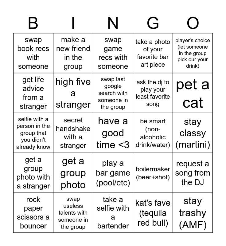 This bingo card has a free space and 31 words: take a selfie with a bartender, take a selfie with a bouncer, secret handshake with a stranger, secret handshake with a friend, swap book recs with someone, swap game recs with someone, high five a stranger, boilermaker (beer+shot), be smart (non-alcoholic drink/water), kat's fave (tequila red bull), stay classy (martini), stay trashy (AMF), pet a dog, photo of a dog, pet a cat, photo of a cat, request a song from the DJ, get a group photo, get a group photo with a stranger, play a bar game (pool/etc), player's choice (let someone in the group pick our your drink), signature shot, rock paper scissors a bouncer, make a new friend in the group, ask the dj to play your least favorite song, get life advice from a stranger, take a photo of your favorite bar art piece, selfie with a person in the group that you didn't already know, swap useless talents with someone in the group, swap last google search with someone in the group and share your favorite fun fact with a new person.