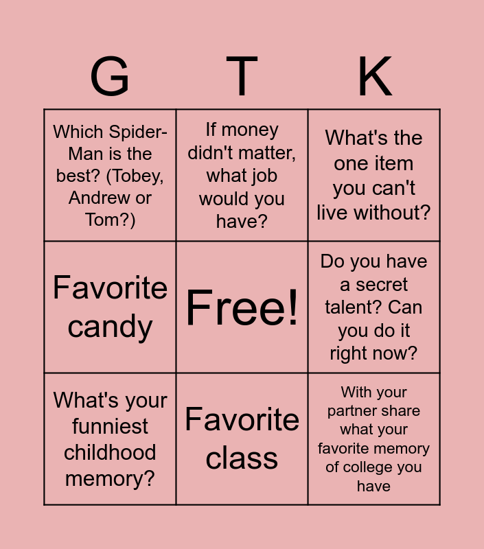 This bingo card has a free space and 8 words: Do you have a secret talent? Can you do it right now?, What's the one item you can't live without?, If money didn't matter, what job would you have?, What's your funniest childhood memory?, Which Spider-Man is the best? (Tobey, Andrew or Tom?), With your partner share what your favorite memory of college you have, Favorite candy and Favorite class.