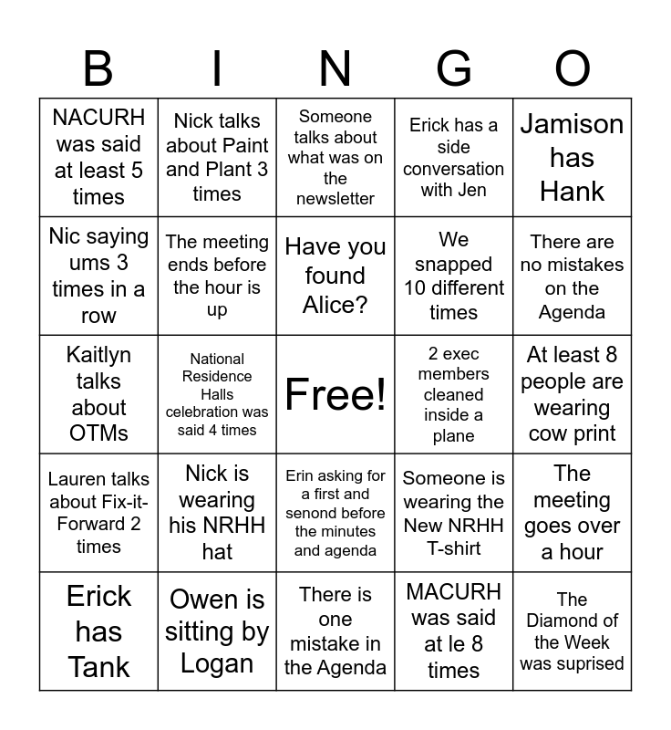 This bingo card has a free space and 25 words: Nick is wearing his NRHH hat, There is one mistake in the Agenda, Have you found Alice?, Erick has Tank, Jamison has Hank, NACURH was said at least 5 times, Nic saying ums 3 times in a row, Nick talks about Paint and Plant 3 times, 2 exec members cleaned inside a plane, Erin asking for a first and senond before the minutes and agenda, We snapped 10 different times, Kaitlyn talks about OTMs, Someone is wearing the New NRHH T-shirt, The meeting goes over a hour, The meeting ends before the hour is up, The meeting started at 8:30pm, At least 8 people are wearing cow print, Someone talks about what was on the newsletter, There are no mistakes on the Agenda, National Residence Halls celebration was said 4 times, The Diamond of the Week was suprised, Owen is sitting by Logan, Lauren talks about Fix-it-Forward 2 times, Erick has a side conversation with Jen and MACURH was said at le 8 times.