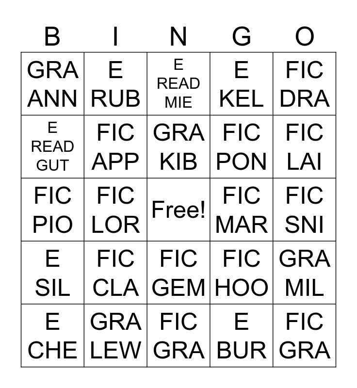 This bingo card has a free space and 46 words: FIC APP, FIC GRA, FIC ROW, FIC GRA, FIC CLA, FIC STI, E RUB, FIC ARN, E READ GUT, GRA PIL, FIC APP, E KEL, GRA MIL, FIC HOO, E NOV, FIC GRA, GRA KIB, FIC MAR, FIC GRE, FIC DRA, FIC LOR, E BUR, GRA ANN, FIC PON, FIC CHO, FIC LAI, E CHE, FIC PAL, FIC GEM, E SIL, GRA COL, FIC RIO, FIV VAN, GRA PAT, FIC RHO, GRA LEW, FIC SNI, FIC KOR, FIC BUY, FIC CAR, FIC BRO, E READ MIE, FIC PIO, FIC STE, GRA GRE and GRA CHA.