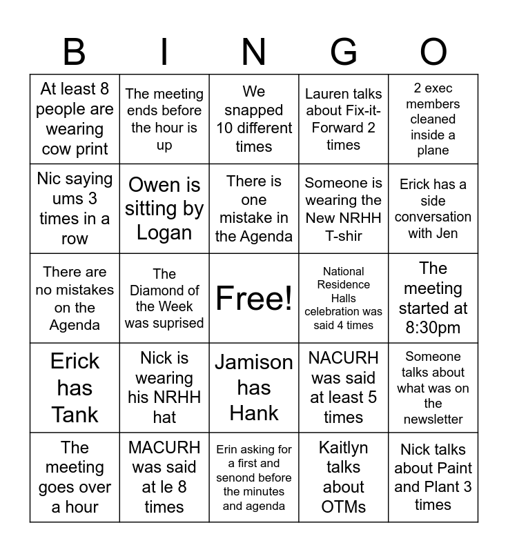This bingo card has a free space and 26 words: Jamison has Hank, Kaitlyn talks about OTMs, There is one mistake in the Agenda, MACURH was said at le 8 times, 2 exec members cleaned inside a plane, At least 8 people are wearing cow print, Nic saying ums 3 times in a row, The meeting ends before the hour is up, The meeting started at 8:30pm, NACURH was said at least 5 times, Someone is wearing the New NRHH T-shir, There are no mistakes on the Agenda, Someone talks about what was on the newsletter, The meeting goes over a hour, The Diamond of the Week was suprised, Have you found Alice?, Lauren talks about Fix-it-Forward 2 times, Erick has Tank, We snapped 10 different times, Nick talks about Paint and Plant 3 times, Erick has a side conversation with Jen, Erin asking for a first and senond before the minutes and agenda, National Residence Halls celebration was said 4 times, Nick is wearing his NRHH hat, Owen is sitting by Logan and 5 MOOs were done.