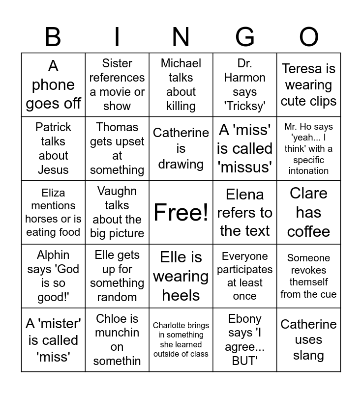 This bingo card has a free space and 24 words: Elle gets up for something random, Chloe is munchin on somethin, Catherine is drawing, A 'mister' is called 'miss', Teresa is wearing cute clips, A phone goes off, Patrick talks about Jesus, Sister references a movie or show, Elena refers to the text, Elle is wearing heels, A 'miss' is called 'missus', Eliza mentions horses or is eating food, Everyone participates at least once, Someone revokes themself from the cue, Thomas gets upset at something, Ebony says 'I agree... BUT', Clare has coffee, Michael talks about killing, Mr. Ho says 'yeah... I think' with a specific intonation, Vaughn talks about the big picture, Catherine uses slang, Alphin says 'God is so good!', Dr. Harmon says 'Tricksy' and Charlotte brings in something she learned outside of class.