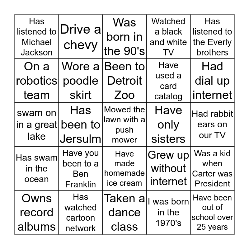 This bingo card has 25 words: Have you been to a Ben Franklin, Taken a dance class, Been to Detroit Zoo, Owns record albums, Has listened to the Everly brothers, Has listened to Michael Jackson, On a robotics team, Drive a chevy, Have only sisters, Have made homemade ice cream, Have used a card catalog, swam on in a great lake, Grew up without internet, Was a kid when Carter was President, Wore a poodle skirt, Have been out of school over 25 years, Had rabbit ears on our TV, Was born in the 90's, Had dial up internet, Has been to Jersulm, Mowed the lawn with a push mower, Has watched cartoon network, Has swam in the ocean, Watched a black and white TV and I was born in the 1970's.