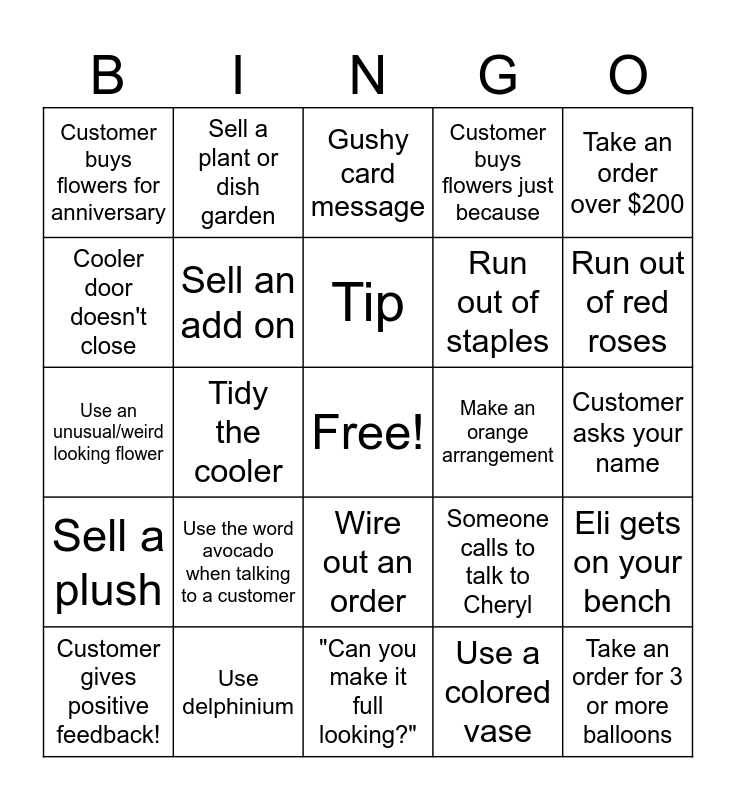 This bingo card has a free space and 34 words: Customer asks you to "make it nice.", Use a colored vase, Offer to help a customer to their car., Wash buckets, Sell a plush, Sell an add on, Take an order over $200, Customer gives positive feedback!, Sell a plant or dish garden, Do you have blue/black roses?, Tip, Gushy card message, Funny card message, Use tulips, Make an orange arrangement, Run out of red roses, Use delphinium, Use an unusual/weird looking flower, Use the word avocado when talking to a customer, Someone calls to talk to Cheryl, Wire out an order, Customer says "You're the professional", Customer buys flowers for anniversary, Customer asks your name, "Can you make it full looking?", Take an order for 3 or more balloons, Customer buys flowers just because, Clean something, Run out of staples, Cooler door doesn't close, Order for Johnson City TN, Tidy the cooler, Eli gets on your bench and Flower delivery is late.