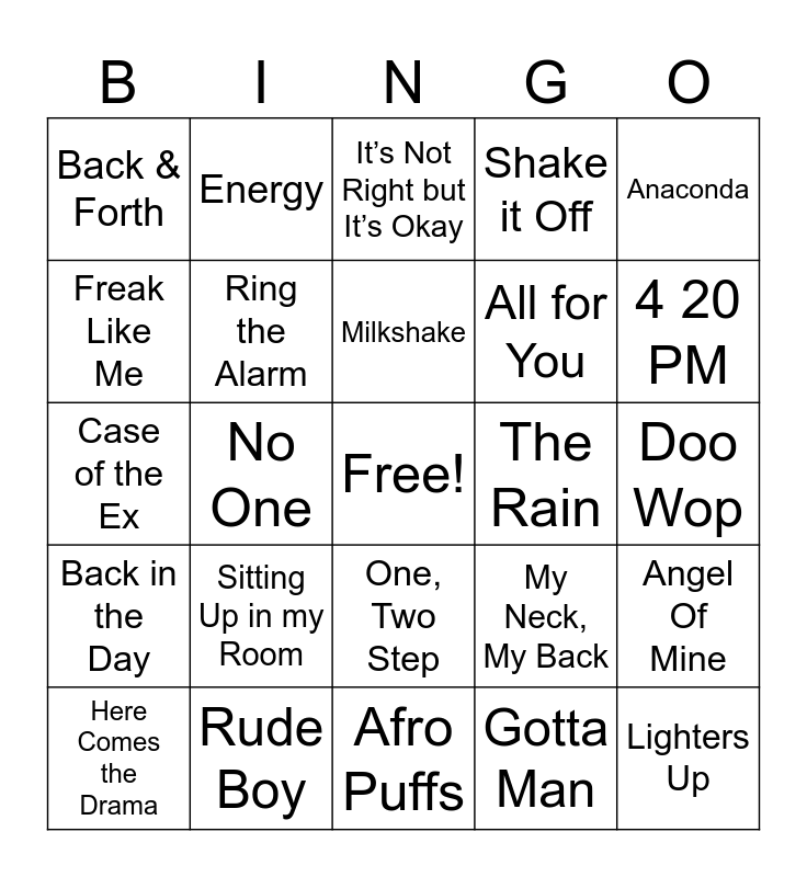This bingo card has a free space and 40 words: Get Ur Freak On, Case of the Ex, He Wasn’t Man Enough, Ring the Alarm, Rude Boy, One, Two Step, Milkshake, Bodak Yellow, Anaconda, Back in the Day, No One, Shake it Off, Lighters Up, Doo Wop, The Rain, Sitting Up in my Room, GET ME HOME, Back & Forth, Love Like This, It’s Not Right but It’s Okay, Angel Of Mine, Gotta Man, All for You, Freak Like Me, Hit Em Up Style, Foolish, Jenny from the Block, Don’t Mess with my Man, Ladies First, Work it Out, You Might Need Somebody, Here Comes the Drama, What’chu Like, My Neck, My Back, 4 20 PM, Afro Puffs, Going Crazy, Work, Energy and Give it to Me Right.