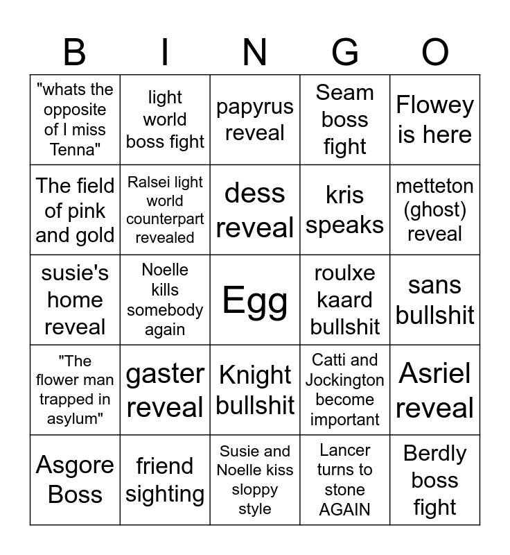 This bingo card has a free space and 24 words: gaster reveal, friend sighting, dess reveal, Asgore Boss, Flowey is here, "whats the opposite of I miss Tenna", The field of pink and gold, light world boss fight, roulxe kaard bullshit, Knight bullshit, kris speaks, susie's home reveal, Catti and Jockington become important, Asriel reveal, Ralsei light world counterpart revealed, Lancer turns to stone AGAIN, sans bullshit, papyrus reveal, metteton (ghost) reveal, Noelle kills somebody again, Berdly boss fight, "The flower man trapped in asylum", Seam boss fight and Susie and Noelle kiss sloppy style.
