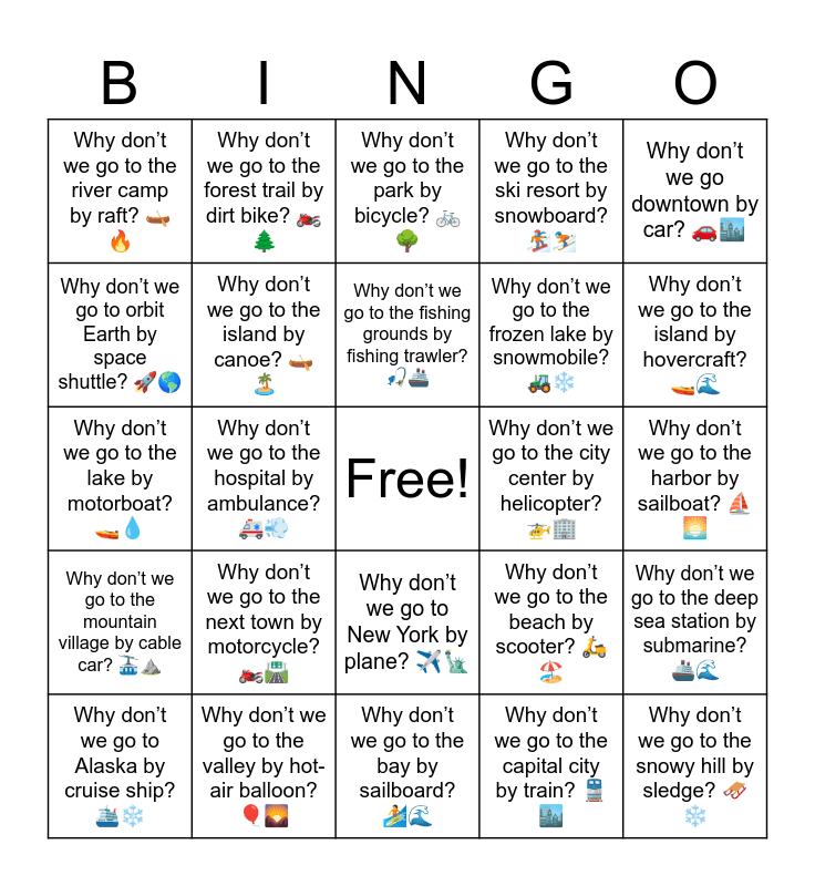 This bingo card has a free space and 33 words: Why don’t we go to Paris by plane? ✈️🌍, Why don’t we go to Hawaii by cargo ship? 🚢🌊, Why don’t we go to the hospital by ambulance? 🚑💨, Why don’t we go to the countryside by bus? 🚌🌾, Why don’t we go to the mountain village by cable car? 🚠⛰️, Why don’t we go to the island by canoe? 🛶🏝️, Why don’t we go downtown by car? 🚗🏙️, Why don’t we go to Alaska by cruise ship? 🛳️❄️, Why don’t we go to the forest trail by dirt bike? 🏍️🌲, Why don’t we go to the fire station by fire engine? 🚒🔥, Why don’t we go to the fishing grounds by fishing trawler? 🎣🚢, Why don’t we go to the park by bicycle? 🚲🌳, Why don’t we go to the track by go kart? 🏎️🏁, Why don’t we go to the hilltop by hang glider? 🪂🌄, Why don’t we go to the city center by helicopter? 🚁🏢, Why don’t we go to the island by hovercraft? 🚤🌊, Why don’t we go to the valley by hot-air balloon? 🎈🌄, Why don’t we go to the lake by motorboat? 🚤💧, Why don’t we go to the next town by motorcycle? 🏍️🛣️, Why don’t we go to the beach by scooter? 🛵🏖️, Why don’t we go to New York by plane? ✈️🗽, Why don’t we go to the dunes by quad bike? 🏜️🚜, Why don’t we go to the river camp by raft? 🛶🔥, Why don’t we go to the harbor by sailboat? ⛵🌅, Why don’t we go to the bay by sailboard? 🏄🌊, Why don’t we go to the snowy hill by sledge? 🛷❄️, Why don’t we go to the ski resort by snowboard? 🏂⛷️, Why don’t we go to the frozen lake by snowmobile? 🚜❄️, Why don’t we go to orbit Earth by space shuttle? 🚀🌎, Why don’t we go to the deep sea station by submarine? 🚢🌊, Why don’t we go to the farm by tractor? 🚜🌾, Why don’t we go to the capital city by train? 🚆🏙️ and Why don’t we go to the market by truck? 🚚🛒.