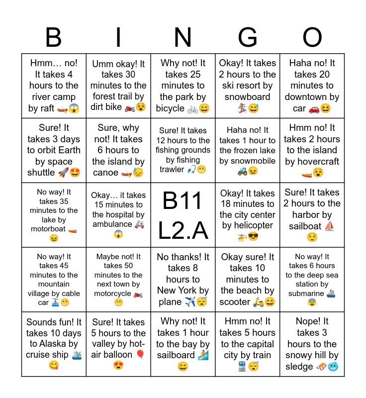 This bingo card has a free space and 33 words: Sure! It takes 2 hours to Paris by plane βοΈπ, No thanks! It takes 3 days to Hawaii by cargo ship π’π, Okayβ¦ it takes 15 minutes to the hospital by ambulance ππ±, Hmm, maybe! It takes 1 hour to the countryside by bus ππ , No way! It takes 45 minutes to the mountain village by cable car π π¬, Sure, why not! It takes 6 hours to the island by canoe πΆπ, Haha no! It takes 20 minutes to downtown by car ππ, Sounds fun! It takes 10 days to Alaska by cruise ship π³οΈπ, Umm okay! It takes 30 minutes to the forest trail by dirt bike ποΈπ΅, Nope! It takes 5 minutes to the fire station by fire engine ππ, Sure! It takes 12 hours to the fishing grounds by fishing trawler π£π¬, Why not! It takes 25 minutes to the park by bicycle π²π, Haha yes! It takes 3 minutes to the track by go kart ποΈπ, No thanks! It takes 40 minutes to the hilltop by hang glider πͺπ¨, Okay! It takes 18 minutes to the city center by helicopter ππ, Hmm no! It takes 2 hours to the island by hovercraft π€π΅, Sure! It takes 5 hours to the valley by hot-air balloon ππ, No way! It takes 35 minutes to the lake by motorboat π€π, Maybe not! It takes 50 minutes to the next town by motorcycle ποΈπ¬, Okay sure! It takes 10 minutes to the beach by scooter π΅π, No thanks! It takes 8 hours to New York by plane βοΈπ΄, Haha yes! It takes 1 hour to the dunes by quad bike ποΈπ, Hmmβ¦ no! It takes 4 hours to the river camp by raft πΆπ±, Sure! It takes 2 hours to the harbor by sailboat β΅π, Why not! It takes 1 hour to the bay by sailboard ππ, Nope! It takes 3 hours to the snowy hill by sledge π·π₯Ά, Okay! It takes 2 hours to the ski resort by snowboard ππ , Haha no! It takes 1 hour to the frozen lake by snowmobile ππ, Sure! It takes 3 days to orbit Earth by space shuttle ππ€©, No way! It takes 6 hours to the deep sea station by submarine π’π¨, Okay maybe! It takes 2 hours to the farm by tractor ππ , Hmm no! It takes 5 hours to the capital city by train ππ΄ and Sure why not! It takes 1 hour to the market by truck ππ.