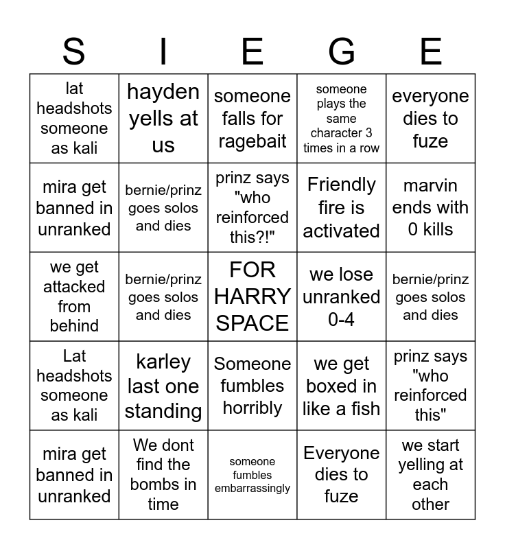 This bingo card has a free space and 80 words: "let me finka bout it", prinz dies first, someone falls for ragebait, angie rage quits, hayden yells at us, someone dies to a grenade, marvin ends with 0 kills, "can someone put a rotate here?", someone moves during lion's skill, bernie burns his teammates, we play on the plane map (the incident), marvin accidentally kills himself, someone plays the same character 3 times in a row, lat headshots someone as kali, we get boxed in like a fish, mira get banned in unranked, first person holding defuse dies, karley last one standing, we don't find the bombs in time, bernie/prinz goes solos and dies, we lose unranked 0-4, everyone dies to fuze, we get attacked from behind, prinz says "who reinforced this?!", bernie/prinz goes solos and dies, we get boxed in like a fish, we play on the plane map (the incident), "let me finka bout it", someone dies to a grenade, prinz dies first, marvin ends with 0 kills, marvin accidentally kills himself, someone fumbles embarrassingly, someone activates friendly fire, mira get banned in unranked, we lose unranked 0-4, everyone dies to fuze, first person holding defuse dies, "can someone put a rotate here?", we start yelling at each other, angie rage quits, someone moves during lion's skill, someone plays the same character 3 times in a row, karley last one standing, we get attacked from behind, hayden yells at us, insane clutch, bernie burns his teammates, lat headshots someone as kali, we don't find the bombs in time, prinz says "who reinforced this", bernie/prinz goes solos and dies, we get boxed in like a fish, we play on the plane map (the incident), "let me finka bout it", Someone dies to a grenade, Prinz dies first, Marvin ends with 0 kills, Marvin accidentally kills himself, Someone fumbles horribly, Friendly fire is activated, Mira gets banned in unranked, Angie rage quits, Someone moves during lion’s skill, Someone plays the same character 3 times in a row, Karley last one standing, We get attacked from behind, Hayden yells at us, Insane clutch, Bernie burns his teammates, Lat headshots someone as kali, We dont find the bombs in time, Prinz says “who reinforced this”, Bernie goes solos and dies, Prinz goes solos and dies, Horrible aim, Everyone dies to fuze, First person holding defuse dies, “Can someone put a rotate here?” and We start yelling at each other.