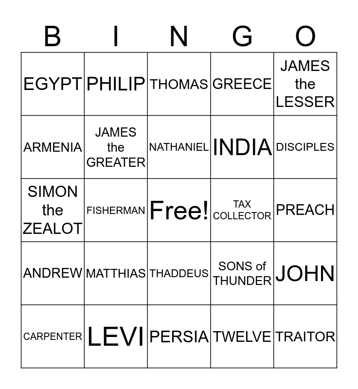 This bingo card has a free space and 32 words: TWELVE, APOSTLES, FISHERMAN, PETER, ANDREW, JAMES the GREATER, JAMES the LESSER, JOHN, PHILIP, BARTHOLOMEW, NATHANIEL, THOMAS, MATTHEW, GOSPEL, TAX COLLECTOR, JUDAS ISCARIOT, CARPENTER, SIMON the ZEALOT, THADDEUS, MATTHIAS, SONS of THUNDER, MARTYR, PREACH, LEVI, TRAITOR, GREECE, INDIA, ARMENIA, EGYPT, PERSIA, LAST SUPPER and DISCIPLES.