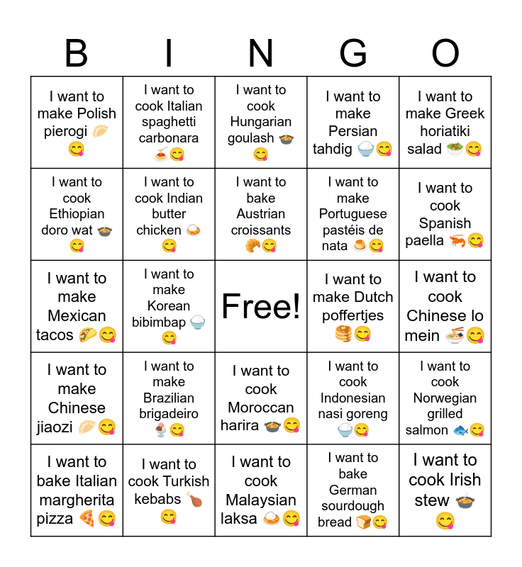 This bingo card has a free space and 33 words: I want to bake French baguettes ๐ฅ๐, I want to cook Japanese ramen ๐๐, I want to make Korean bibimbap ๐๐, I want to cook Thai tom yum ๐ฒ๐, I want to make Chinese jiaozi ๐ฅ๐, I want to cook Indian butter chicken ๐๐, I want to make Greek horiatiki salad ๐ฅ๐, I want to bake Italian margherita pizza ๐๐, I want to cook Italian spaghetti carbonara ๐๐, I want to bake American cheesecake ๐๐, I want to bake Austrian croissants ๐ฅ๐, I want to cook Hungarian goulash ๐ฒ๐, I want to make Vietnamese bรกnh mรฌ ๐ฅช๐, I want to cook American barbecue ribs ๐๐, I want to make Dutch poffertjes ๐ฅ๐, I want to cook Spanish paella ๐ฆ๐, I want to cook Turkish kebabs ๐๐, I want to make Mexican tacos ๐ฎ๐, I want to make Brazilian brigadeiro ๐จ๐, I want to cook Indonesian nasi goreng ๐๐, I want to cook Moroccan harira ๐ฒ๐, I want to bake Indian naan ๐ซ๐, I want to make Polish pierogi ๐ฅ๐, I want to cook Chinese lo mein ๐๐, I want to cook Malaysian laksa ๐๐, I want to cook Irish stew ๐ฒ๐, I want to make Persian tahdig ๐๐, I want to make Portuguese pastรฉis de nata ๐ฎ๐, I want to cook Ethiopian doro wat ๐ฒ๐, I want to cook Norwegian grilled salmon ๐๐, I want to make Japanese takoyaki ๐ข๐, I want to bake German sourdough bread ๐๐ and I want to bake British meat pies ๐ฅง๐.