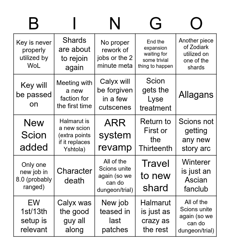 This bingo card has 26 words: All of the Scions unite again (so we can do dungeon/trial), Halmarut is just as crazy as the rest, Calyx will be forgiven in a few cutscenes, Calyx was the good guy all along, Another piece of Zodiark utilized on one of the shards, Key is never properly utilized by WoL, Key will be passed on, Shards are about to rejoin again, Scions not getting any new story arc, Travel to new shard, Scion gets the Lyse treatment, New Scion added, Winterer is just an Ascian fanclub, EW 1st/13th setup is relevant, Halmarut is a new scion (extra points if it replaces Yshtola), WoL loses power between expansions, End the expansion waiting for some trivial thing to happen, Only one new job in 8.0 (probably ranged), No proper rework of jobs or the 2 minute meta, ARR system revamp, Allagans, New job teased in last patches, Return to First or the Thirteenth, Character death, Meeting with a new faction for the first time and All of the Scions unite again (so we can do dungeon/trial).