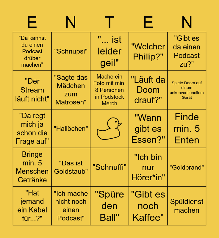 This bingo card has a free space and 27 words: "Ich bin nur Hörer*in", "Gibt es da schon Sticker von?", "Läuft da Doom drauf?", "Spüre den Ball", "Der Stream läuft nicht", "... ist leider geil", "Schnupsi", Bringe min. 5 Menschen Getränke, "Wann gibt es Essen?", "Goldbrand", "Da regt mich ja schon die Frage auf", "Welcher Phillip?", "Hat jemand ein Kabel für...?", "Ich mache nicht noch einen Podcast", Spiele Doom auf einem unkonventionellem Gerät, Etwas wird verschlimmbessert, "Sagte das Mädchen zum Matrosen", Mache ein Foto mit min. 8 Personen in Podstock Merch, "Das ist Goldstaub", "Da kannst du einen Podcast drüber machen", Finde min. 5 Enten, "Gibt es noch Kaffee", "Hallöchen", Spüldienst machen, "Schnuffi", "Gibt es da einen Podcast zu?" and "Welcher Sven?".