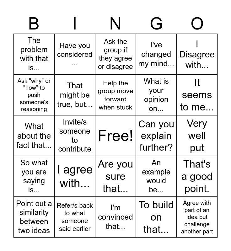 This bingo card has a free space and 24 words: I agree with..., Refer/s back to what someone said earlier, Help the group move forward when stuck, Point out a similarity between two ideas, I Disagree with..., The problem with that is..., Ask "why" or "how" to push someone's reasoning, Have you considered ..., Can you explain further?, Are you sure that..., What is your opinion on..., What about the fact that..., An example would be..., That's a good point., That might be true, but..., To build on that..., Very well put, Ask the group if they agree or disagree, It seems to me..., Invite/s someone to contribute, Agree with part of an idea but challenge another part, So what you are saying is..., I've changed my mind... and I'm convinced that....