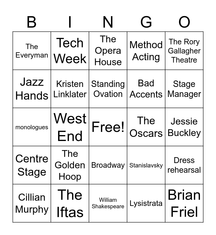 This bingo card has a free space and 29 words: Cillian Murphy, Playbill, West End, National Theatre, The Everyman, The Opera House, Kristen Linklater, The Golden Hoop, The Oscars, The Iftas, Jessie Buckley, Brian Friel, William Shakespeare, Lysistrata, Stage Manager, Director, Broadway, Centre Stage, The Rory Gallagher Theatre, monologues, Stanislavsky, Costumes, Bad Accents, Jazz Hands, Method Acting, Tech Week, Dress rehearsal, Standing Ovation and No Budget.