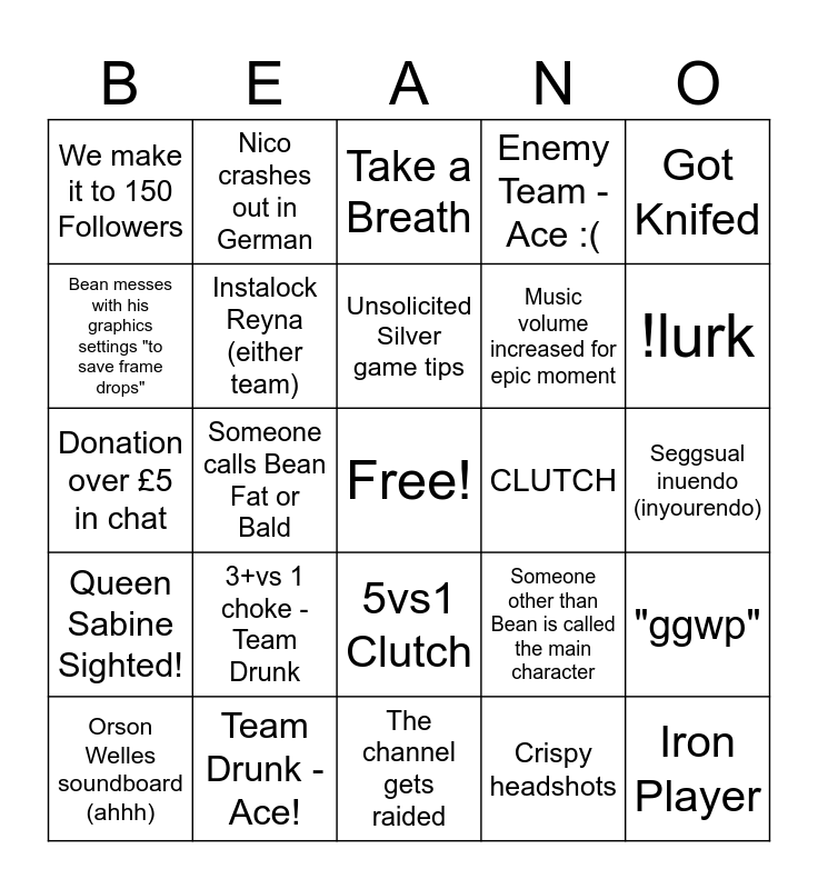 This bingo card has a free space and 44 words: Smurf Detected, Iron Player, Persona 5 music plays on stream, Orson Welles soundboard (ahhh), "no-one saw that/you didn't see that", Crispy headshots, Take a Breath, Missed a knife, Got Knifed, Team Drunk - Ace!, Enemy Team - Ace :(, CLUTCH, 5vs1 Clutch, 3+vs 1 choke - Team Drunk, Adriano the Italiano is iconic in chat, The channel gets raided, 5+ gift subs in chat, Donation over £5 in chat, Jam Jaws bans a bot in chat, !lurk, Nico crashes out in German, The Counsel of Bannan's appears, The Legendary Arkfaucher is seen in chat, We make it to 150 Followers, Ruby Barking, Seggsual inuendo (inyourendo), "I hate this game/I'm quitting", "slay queen", Someone other than Bean is called the main character, Queen Sabine Sighted!, Ruby emote used in chat, "ggwp", "ggez", riot gun buddy spotted, Someone calls Bean Fat or Bald, Slurred Words, Bean deadpan stares at camera, Miss Bean Sighted!, Unsolicited Silver game tips, Bean messes with his graphics settings "to save frame drops", Music volume increased for epic moment, "Fu£$ing Fracture!", Instalock Reyna (either team) and Gold Omen mentioned.