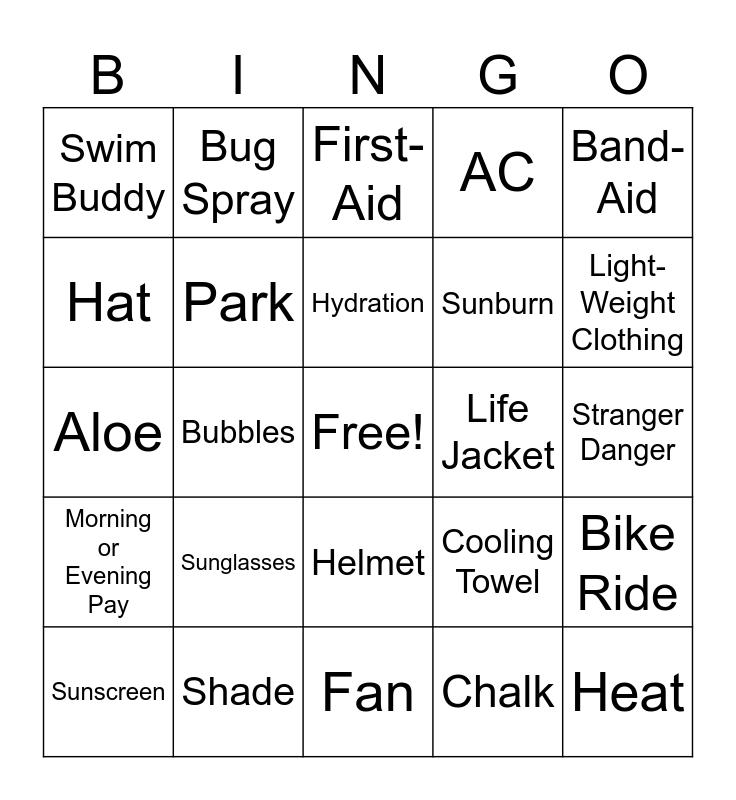 This bingo card has a free space and 24 words: Sunglasses, Shade, Hydration, Sunscreen, Band-Aid, Swim Buddy, Hat, Bug Spray, Life Jacket, Helmet, Sunburn, Aloe, Cooling Towel, Bike Ride, Park, Chalk, Stranger Danger, First-Aid, Light-Weight Clothing, Bubbles, Heat, Morning or Evening Pay, AC and Fan.