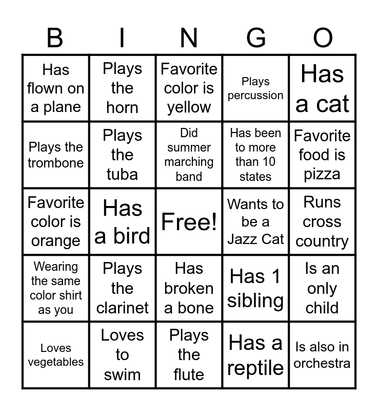 This bingo card has a free space and 46 words: Is also in choir, Is also in orchestra, Is a trio (band/choir/orchestra), Plays the flute, Plays the clarinet, Plays the saxophone, Plays the horn, Plays the trumpet, Plays the trombone, Plays the baritone, Plays the tuba, Plays percussion, Is an only child, Has 1 sibling, Has 2 or more siblings, Did summer concert band, Did summer marching band, Wants to be a Jazz Cat, Has a dog, Has a cat, Has a bird, Has a reptile, Has flown on a plane, Has been to more than 10 states, Can speak 2 languages, Favorite food is pizza, Loves vegetables, Can whistle, Has broken a bone, Wearing the same color shirt as you, Is an 8th grader, Is a 7th grader, Plays a different instrument than you, Plays football, Plays basketball, Loves to swim, Runs cross country, Does track, Loves bowling, Favorite color is red, Favorite color is blue, Favorite color is yellow, Favorite color is orange, Favorite color is green, Favorite color is purple and Favorite color is black.