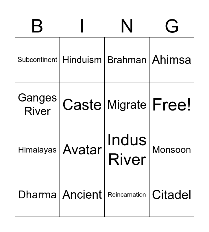 This bingo card has 17 words: Reincarnation, Dharma, Brahman, Subcontinent, Avatar, Ahimsa, Monsoon, Migrate, Free!, Caste, Ancient, Indus River, Ganges River, Hinduism, Himalayas, Nirvana and Citadel.