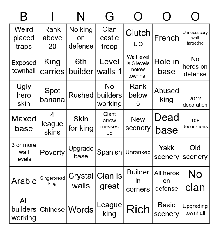 This bingo card has a free space and 48 words: Builder in corners, Hole in base, League king, 4 league skins, Rushed, 10+ decorations, Rank above 20, Chinese, French, Spanish, Unnecessary wall targeting, Clan castle troop, Abused king, Rank below 5, Arabic, Dead base, Exposed townhall, No heros on defense, All heros on defense, Clutch up, Wall level is 3 levels below townhall, Skin for king, Weird placed traps, King carries, No clan, 6th builder, 2012 decoration, All builders working, No builders working, Spot banana, Basic scenery, New scenery, Old scenery, Gingerbread king, Maxed base, Unranked, Yakk scenery, Ugly hero skin, Upgrade base, Crystal walls, 3 or more wall levels, Upgrading townhall, No king on defense, Words, Level walls 1, Clan is great, Poverty and Rich.